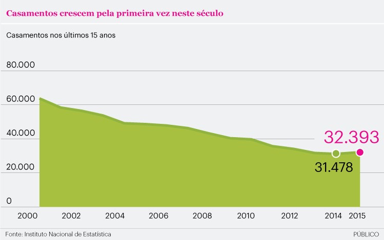 O número de casamentos aumentou em 2015, pela primeira vez desde há muitos anos em Portugal. O Instituto Nacional de Estatística (INE) contou 32.393 casamentos no ano passado, contra os 31.478 do ano anterior. Apesar de não se tratar de um aumento muito expressivo (mais 915 casamentos), este dado contraria a tendência decrescente do número de casamentos das últimas décadas.